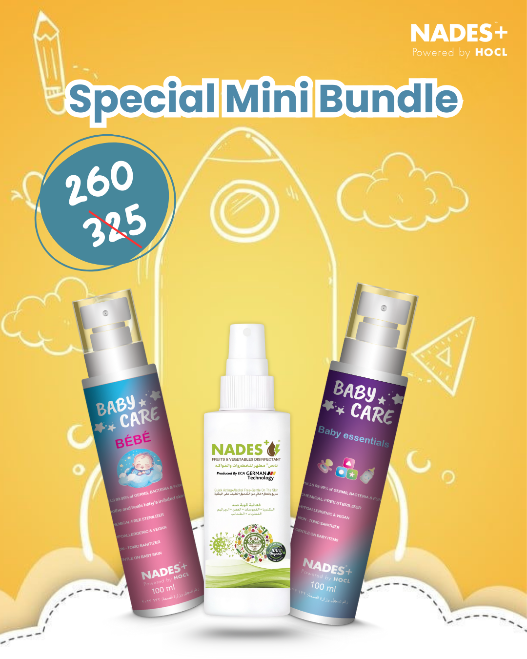 Baby Care Essentials is a natural, alcohol-free disinfectant , completely safe and environmentally friendly. • Designed to disinfect and sanitize all baby tools and accessories with its powerful effect in preventing infections and eliminating 99.99% of bacteria, viruses, and fungi.